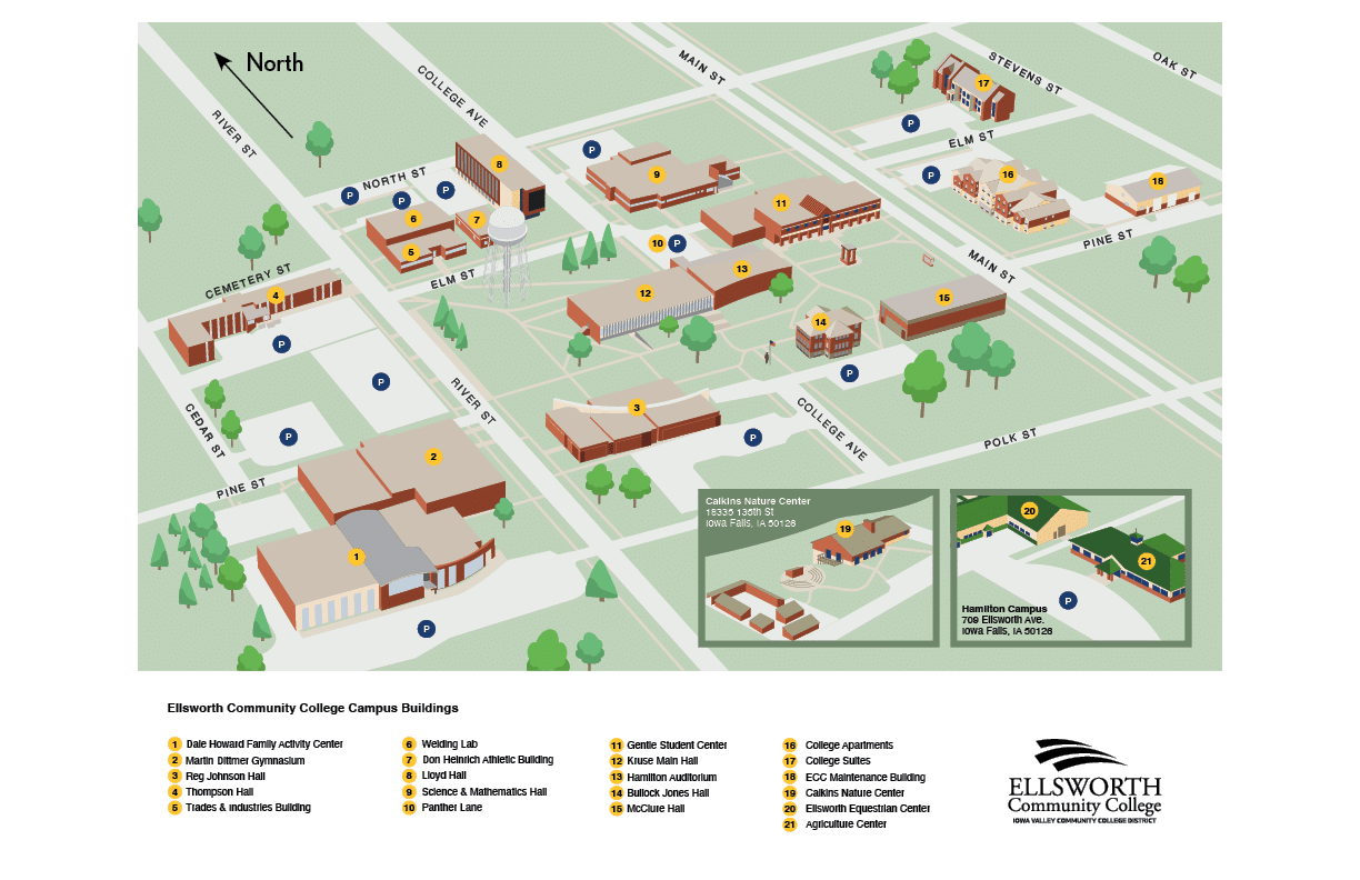 Ellsworth Community College is located at 1100 College Avenue in Iowa Falls, Iowa, in the heart of Iowa Falls (known as “The Scenic City”).