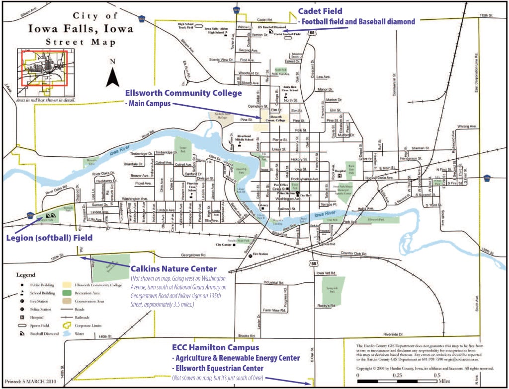 - Ellsworth Equestrian Center – Located on Highway 65 just south of Iowa Falls at 709 Ellsworth Avenue. To get to the Equestrian Center from the main ECC campus, get back onto Highway 65 and go south. The Hamilton Campus is on the south edge of town, on the west side of the highway adjacent to Thiessen’s. The Equestrian Center is the larger of the two buildings on this site.